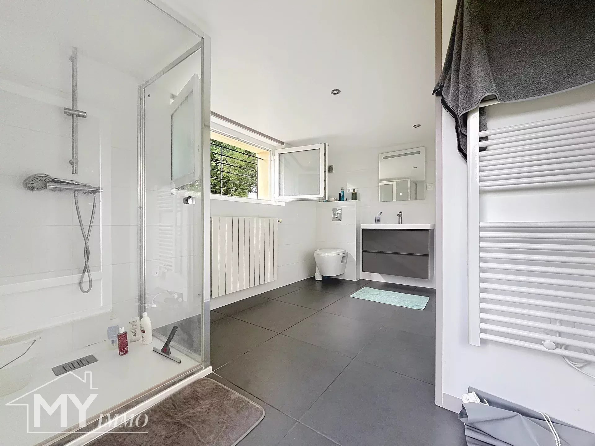 En rez-de-chaussée, un espace bureau vous attend, ainsi qu’une suite parentale avec sa salle d’eau privative. Un garage attenant d’environ 30 m² complète l’ensemble.